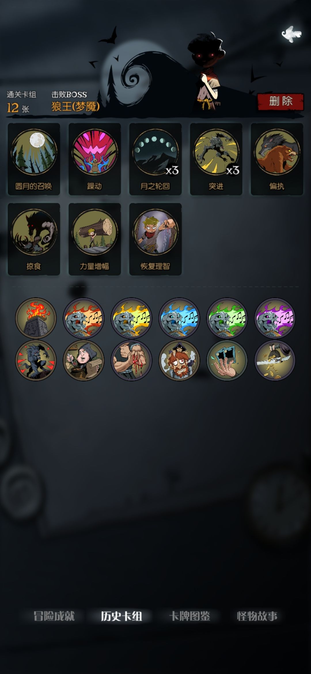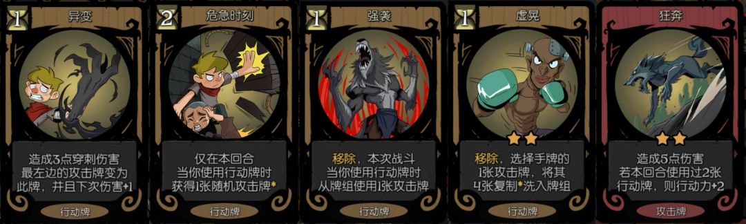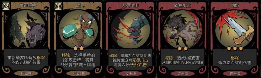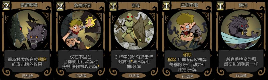 因为带多了攻击牌会卡手,干脆危急时刻印卡,用行动牌刷卡(例如记忆破碎对刷),压抑本能移除换行动力加抽(精简可考虑苦战洗入),然后横扫手牌全部变狼群尽情输出。