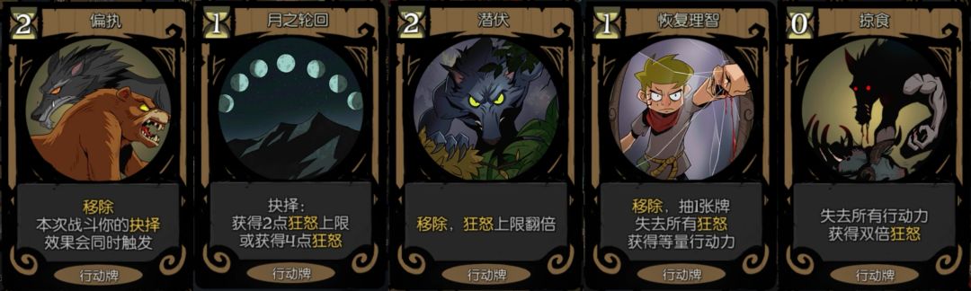 狼人是以行动牌为核心的职业,狂怒跟修女忏悔异曲同工,特色卡牌是偏执和横扫,诠释了什么叫我全都要和向左看齐。