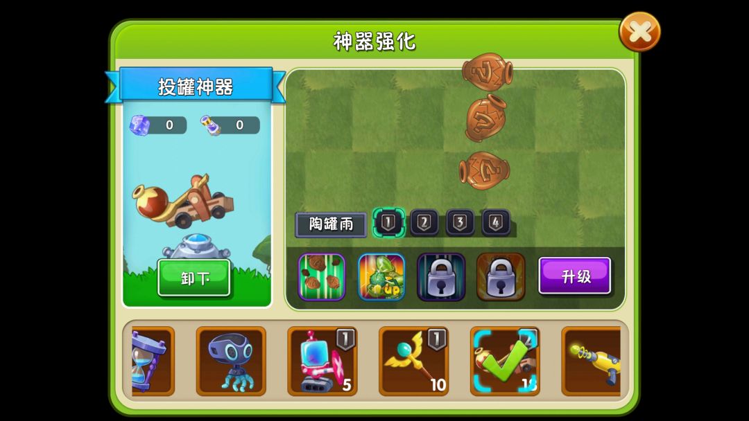 (2)投罐神器:使用后会在场上投出10个罐子(这个罐子不会摧毁场上植物)(罐子里会有:罗马巨人、能量豆普僵、鸡、樱桃炸弹、坚果、土豆地雷,阳光)(这个神器比较看运气,运气好全是樱桃炸弹,运气不好投出小鸡结束战斗)(也可以除去砸罐子出来的阳光额外获得少量阳光将没用的植物种上去然后铲掉获得阳光)