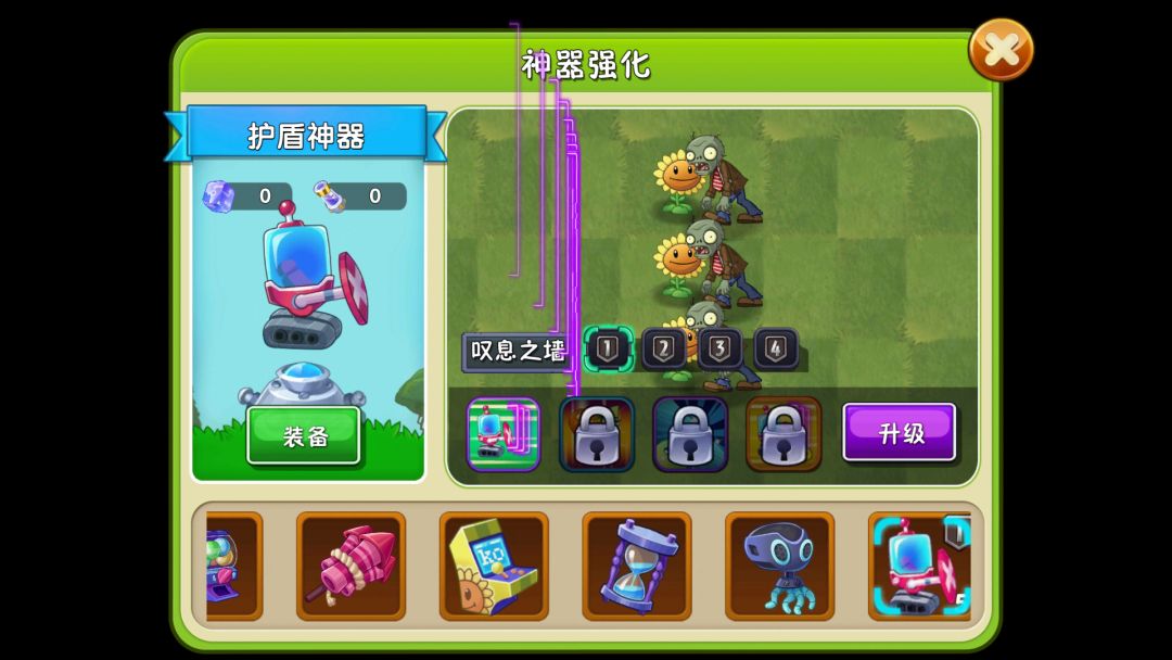 (6)护盾神器:使用后会在屏幕最左边生成一个护盾(护盾类似于未来世界的电磁盾僵尸)这个护盾会从1列推到8列,途中如果推到僵尸就会将僵尸一起带到左面,但会降低护盾移速(回忆之旅做护盾击杀僵尸成就是有要求的,最低要求应该是将该神器升级到2阶14级,这样才能保证僵尸会被推出场外造成击杀)