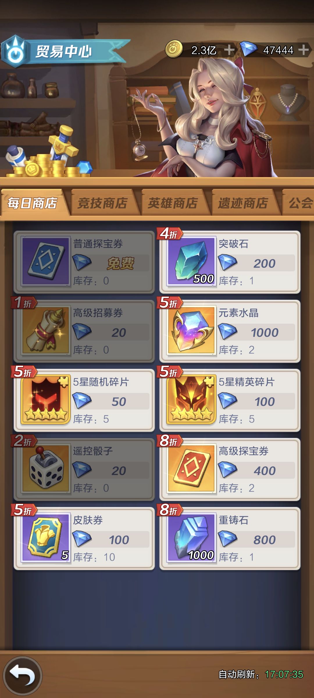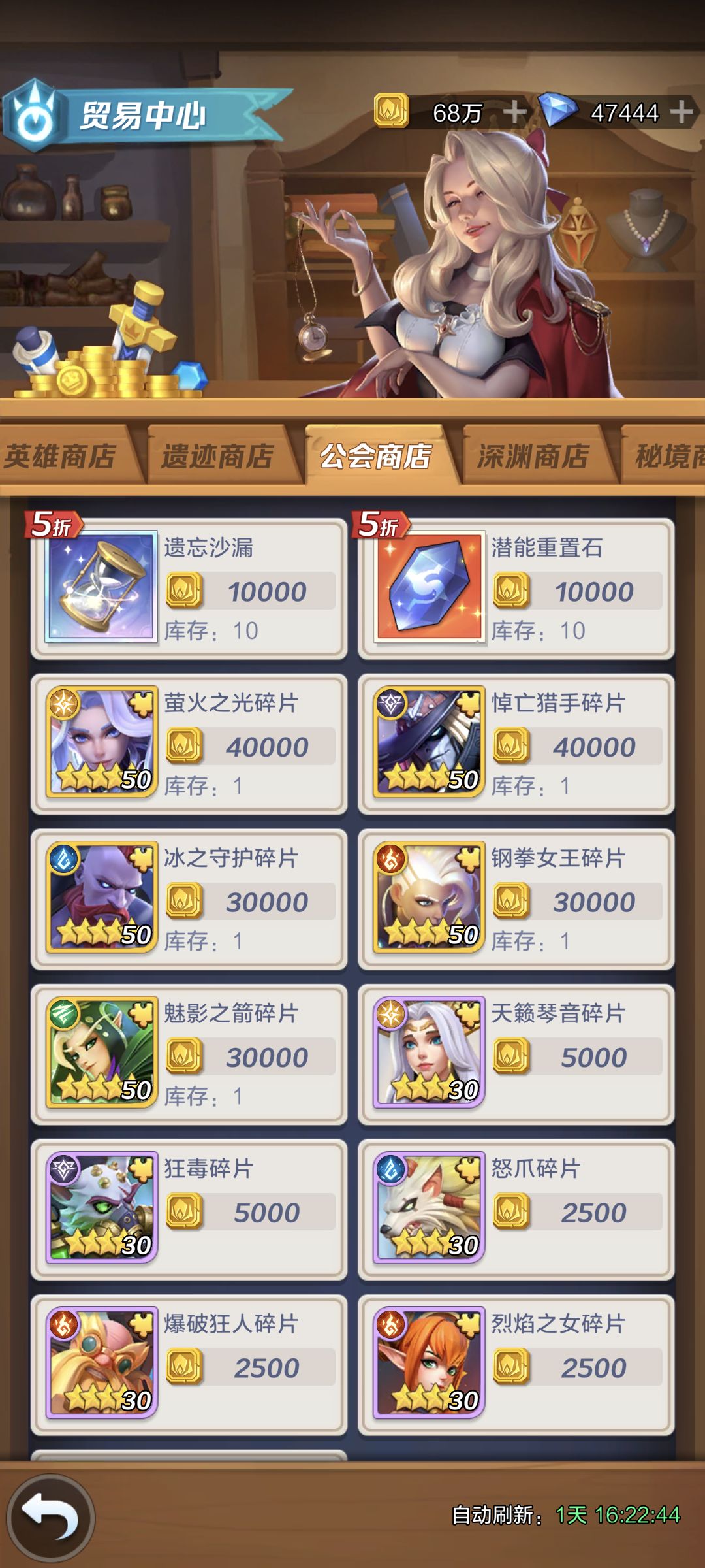 公会商店:前期非常缺狗粮的话换光暗(这个商店四星五星价值一样),能忍着的话最好留着给遗忘沙漏与潜能重置石。后期并不溢出很多,需要十万来重置一次潜能或转职,越多阵容容错率越高。