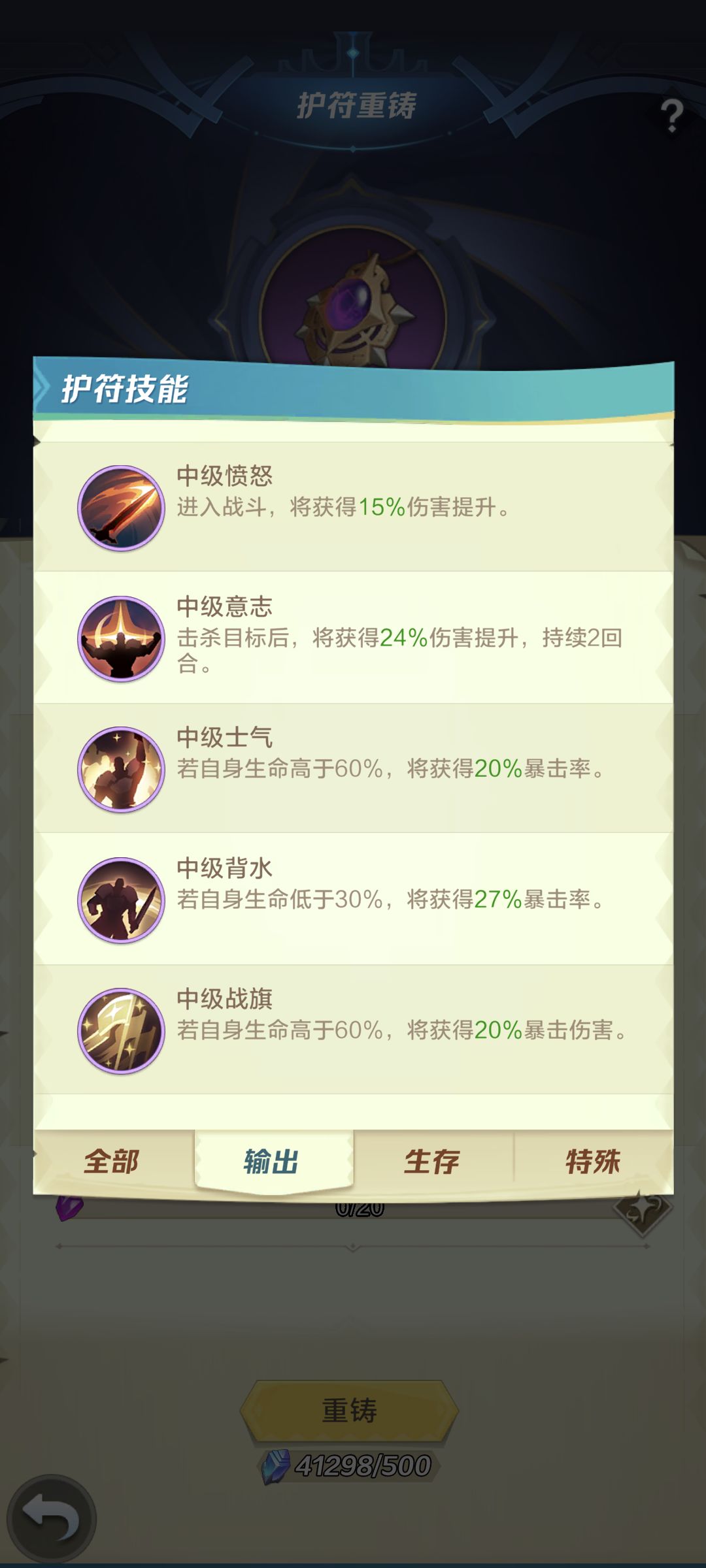 重铸功能从紫色护符开始有保底,保底满了能自选一个技能,建议紫色先别刷,橙色刷出两三个也够了,因为很快就会被红色替代,红色不仅基础属性更强 还会自带入场第一回合的速度提升10%。红色还可以消耗“源生之火”淬炼解锁更多花里胡哨的技能和属性,也就是昨天提到的活动商店里让人很纠结的那个东西。