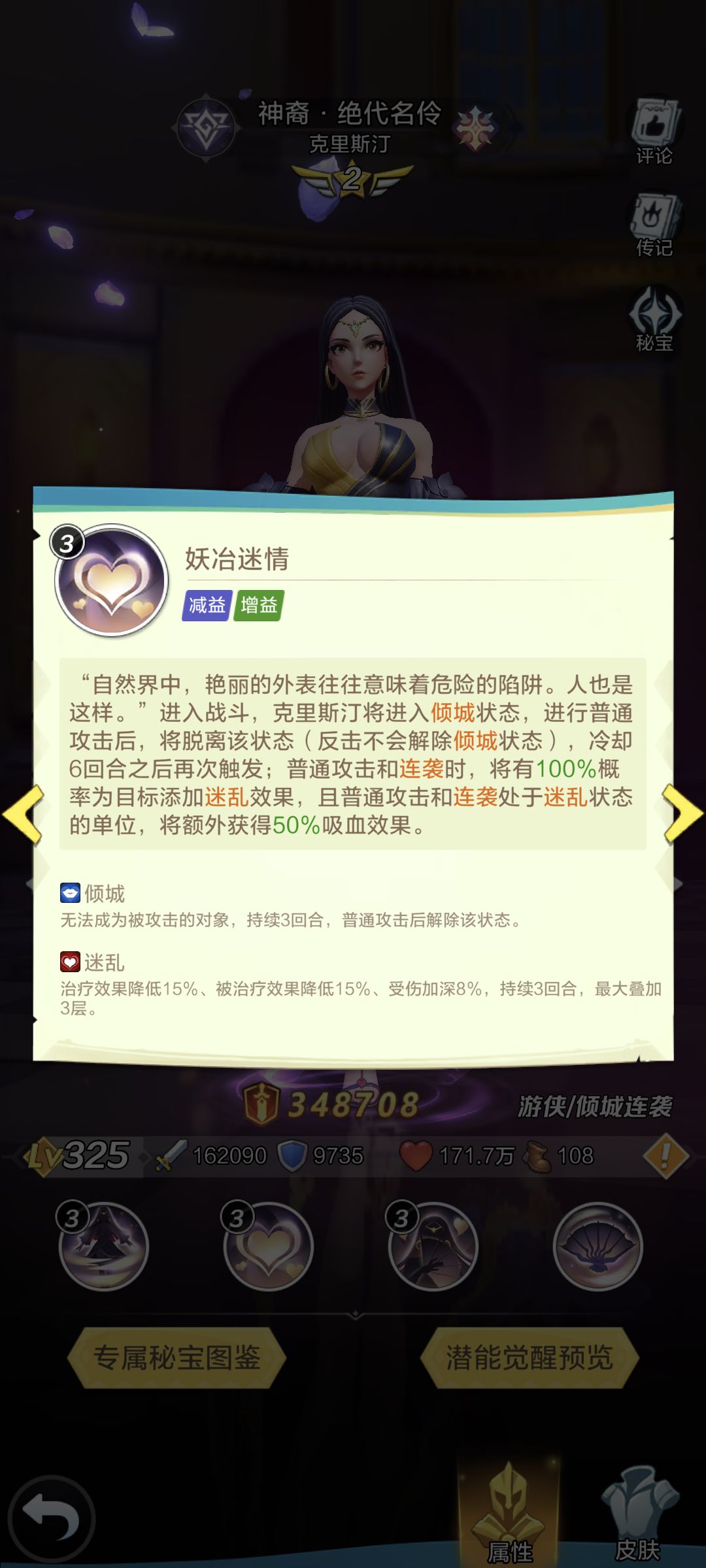②士气、战旗(血量60%以上时暴击爆伤提升):名伶完美技能,有“倾城”状态隐身能保证第一回合的出手吃到这两个护符技能,后续回合也能一直吸血维持较高的血量