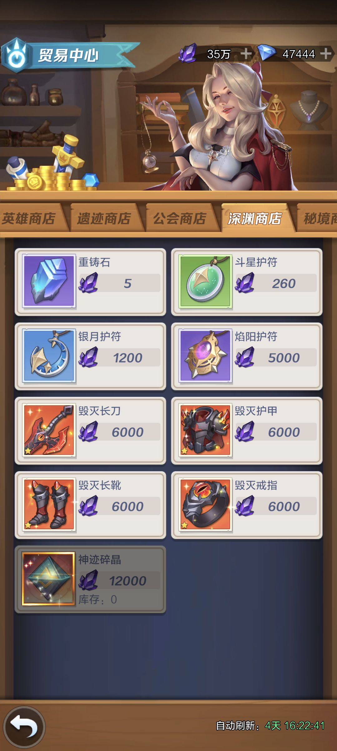 深渊商店:前期买紫色护符加快红护符的进度,传奇装缺共鸣了也可以买红装,主要靠通关奖励(机制类似龙脊之塔,一次性奖励为主)