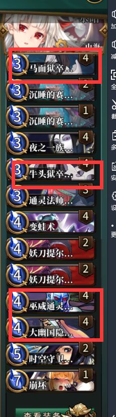卡组主体是我标红的四张卡,牛头马面主要是为了给魔法卡触发两个通灵的异能召唤僵尸,召唤的僵尸则是为了触发“夜之一族”、大幽国、古神。特别是大幽国,在妖刀的情况下特别爆炸,如果环境蓝色玩家比较多,可以考虑带守秘人,换掉时空守卫。