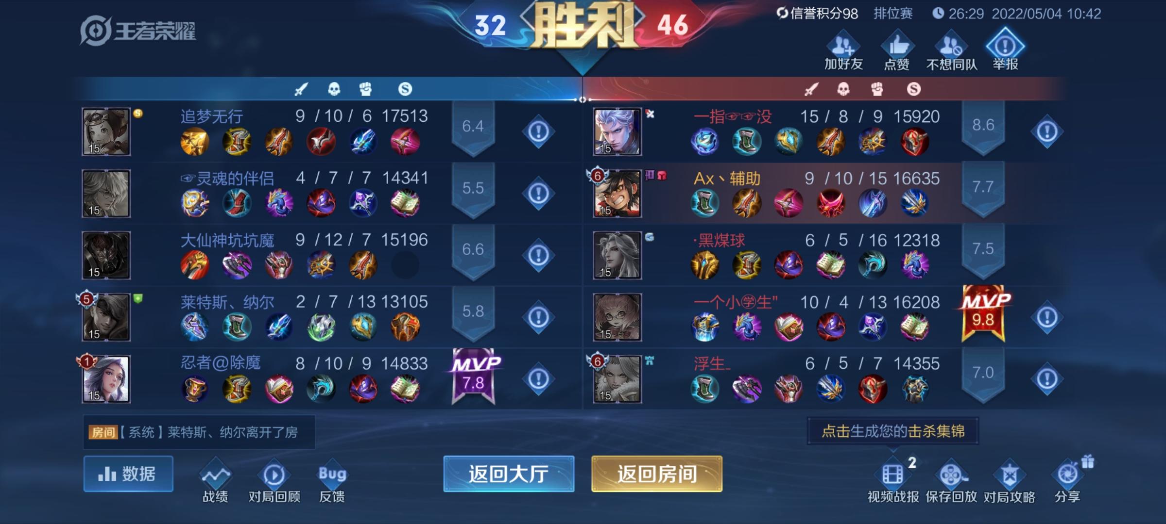 真棒,死妈护卫队太强了,玩个明世隐不牵人,见着残血就连上大招抢人头,射手全场一打三,辅助中路当看不见,老子说两句就禁言,演员举报不成功,很好,真的很好,