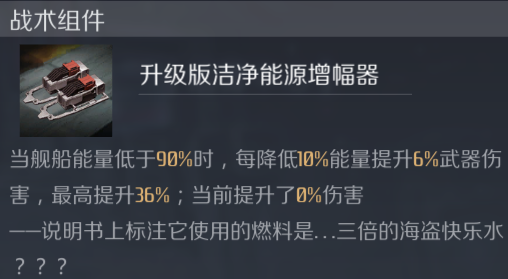 当舰船能量低于90%时,每降低10%能量提升6%武器伤害,最高提升36%;当前提升了0%伤害。