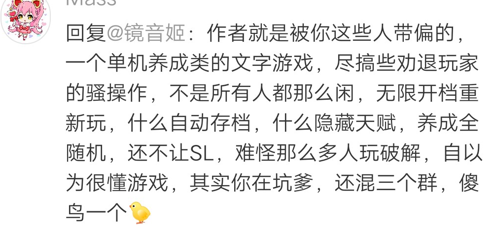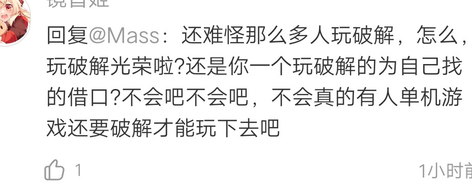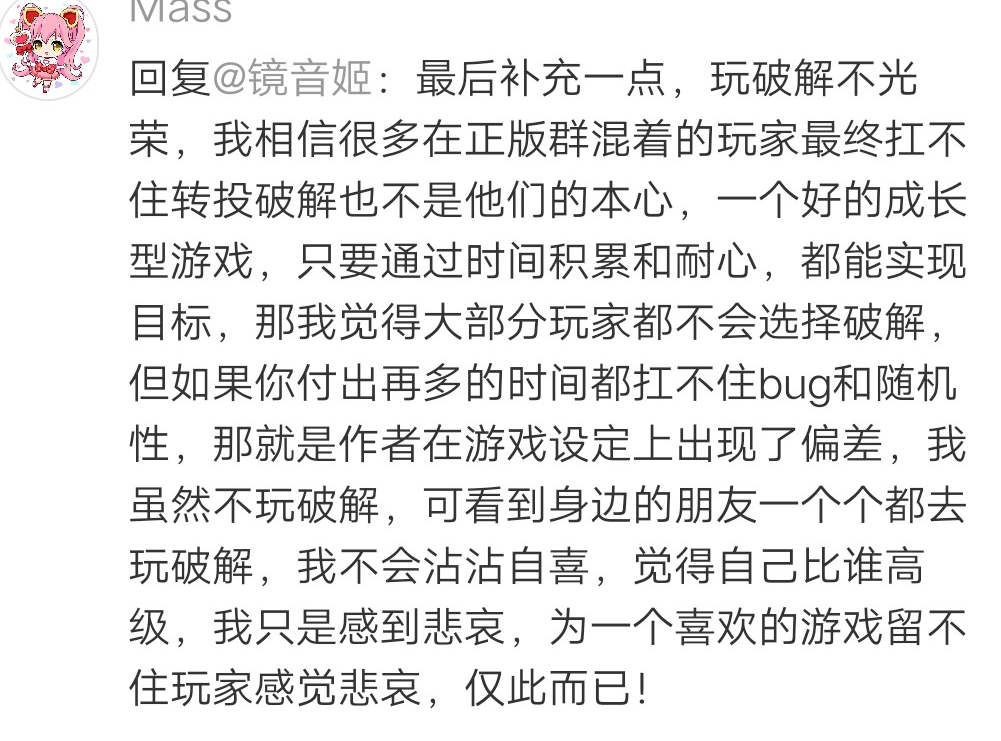 无论你说的怎么冠冕堂皇,依旧改变不了你为破解开脱的理由,如果你真的喜欢这款游戏,应该是抵制破解,而不是对破解玩家进行“理解”,官方群一直是不支持破解的!!!