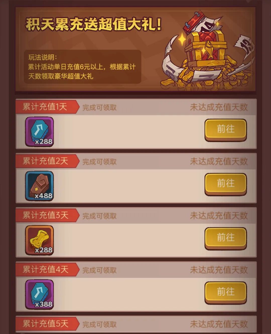 3)首冲礼包(¥6)+终身卡(¥128)+福卡(¥198)+月卡(¥30)+积天好礼(¥6/天)