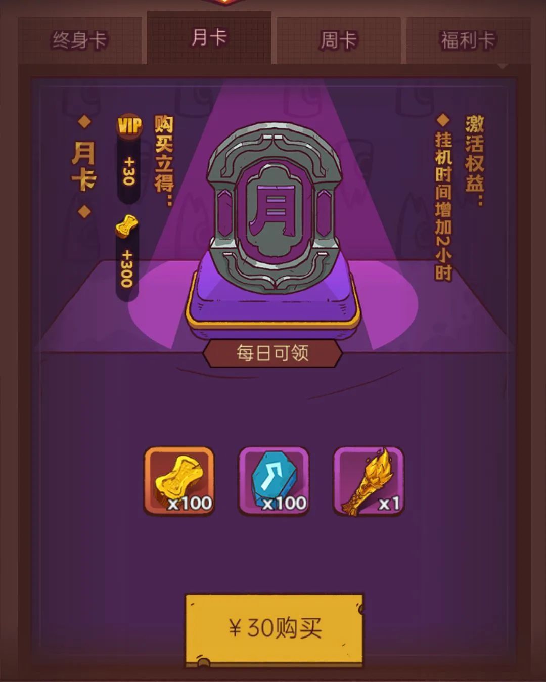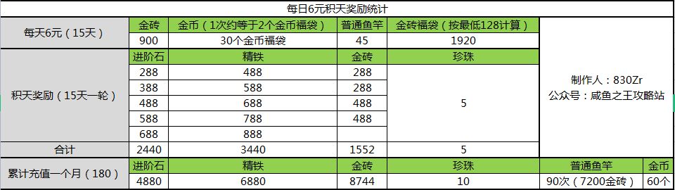 30块月卡,一个月总共收获3000金砖+3000进阶石+30个咸神火把。也是比较划算,中氪玩家可以入手。
