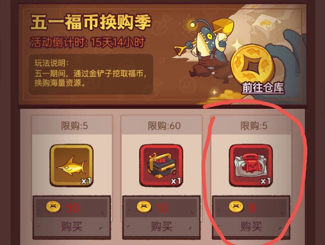 像五一活动,钱比较多的氪金大佬可以拿五星黄金鱼灵,钱少点的可以拿完五星赤羽后,就搞万能红将碎片(优先)和随机红将碎片(最后)