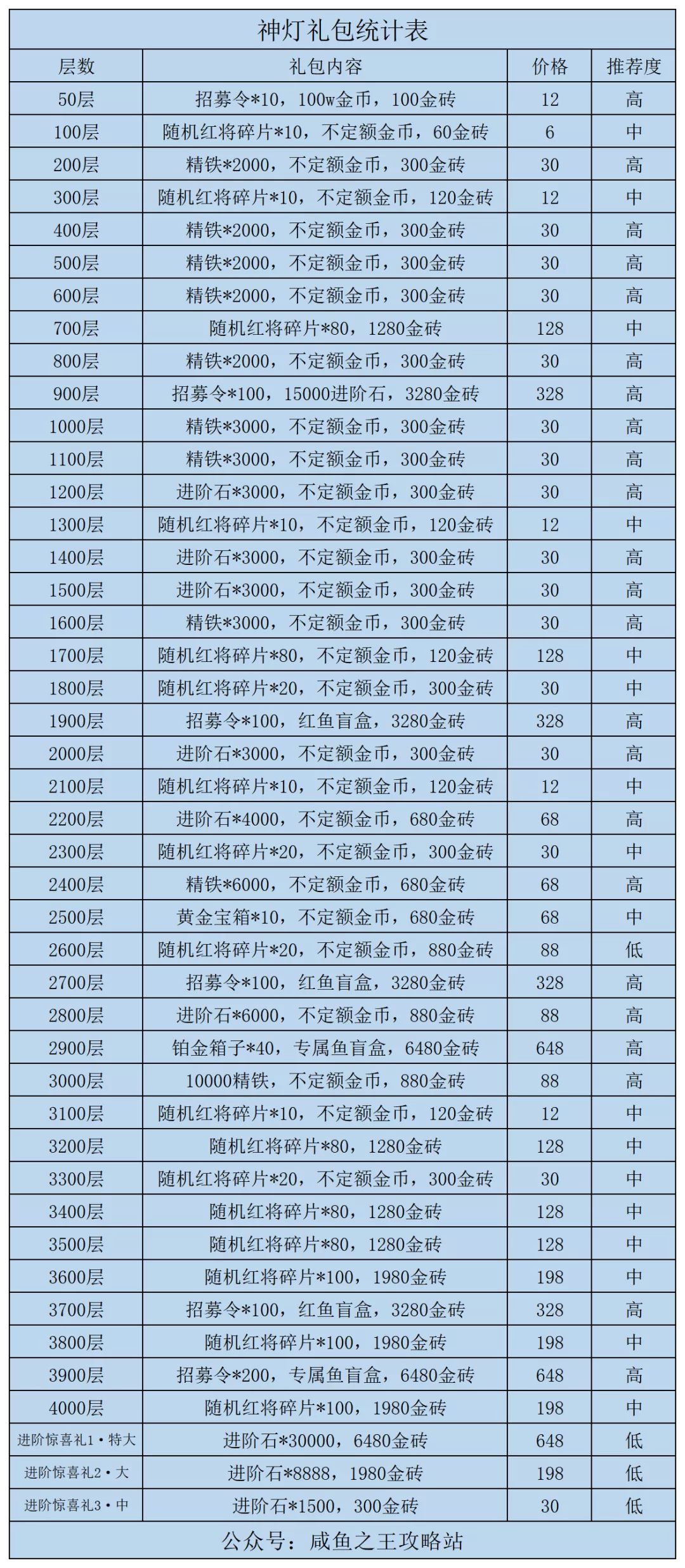 中氪玩家氪神灯礼包,选择推荐度为高的神灯礼包氪金。优先进阶石,其次精铁,最后招募令+鱼灵。