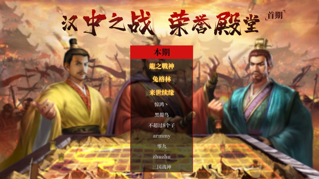 第一期汉中之战的榜单前十主公大大们依次是:龍之戰神、兔格林、来世续缘、惊鸿丶、黑撮鸟、不超过8个子、armmy、零九、zhuzhu、三国战神