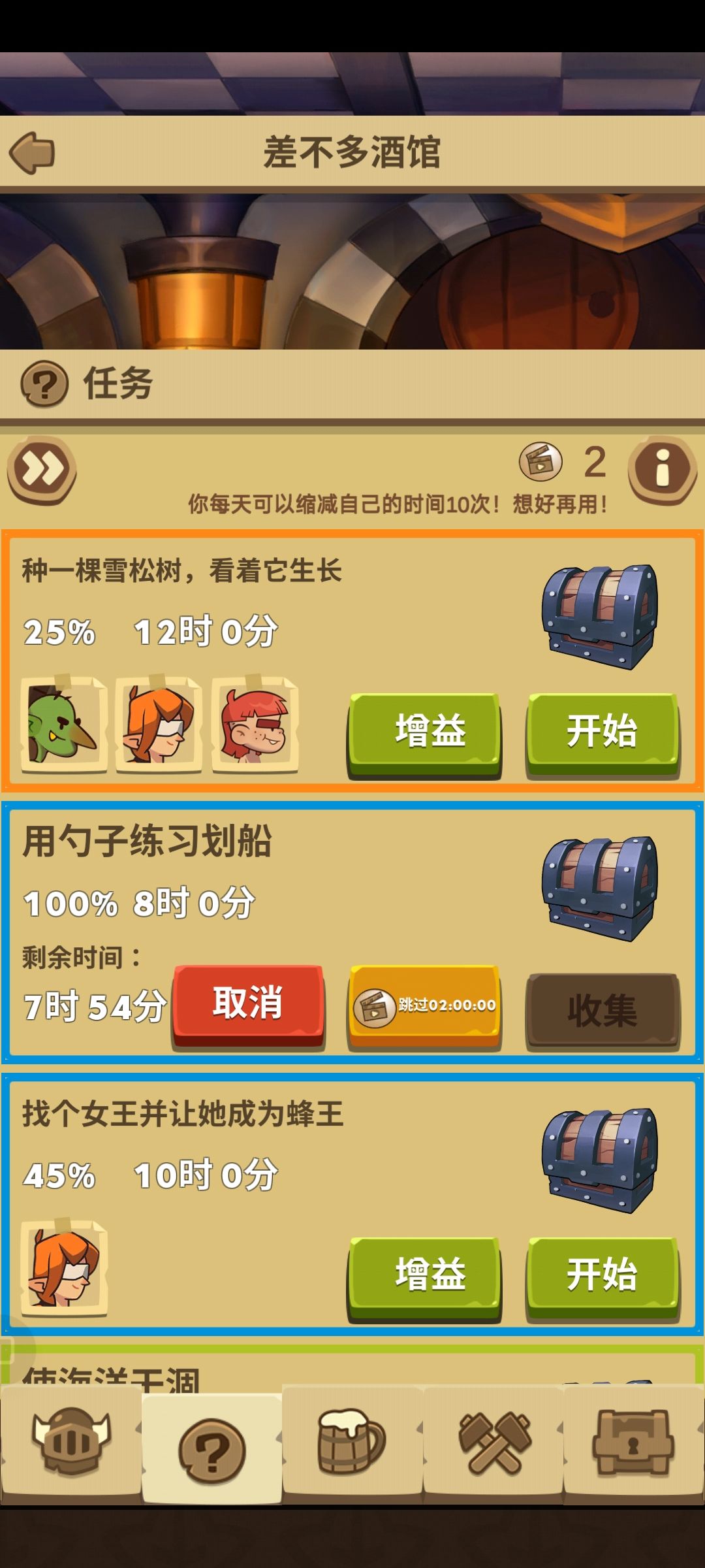 酒馆任务的报酬增加了一倍,而且增加了广告加速按钮,每次减少20%任务时长,每天只能加速10次(我觉得我自己用不完),每个任务只能使用两次(我目前验证是这样)。花费还会进一步平衡(估计是下调),缺资源的可以等等再升(都玩酒馆了,估计你们也不缺),不过具体时间就不知道了