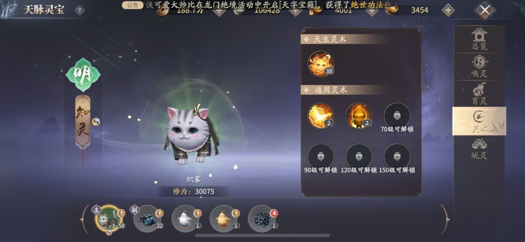 在灵术界面,可以查看灵宝的灵术,灵术就是灵宝的技能,灵宝除了自带的天生灵术外,还可以给灵宝学习通用灵术,使灵宝更加强大。