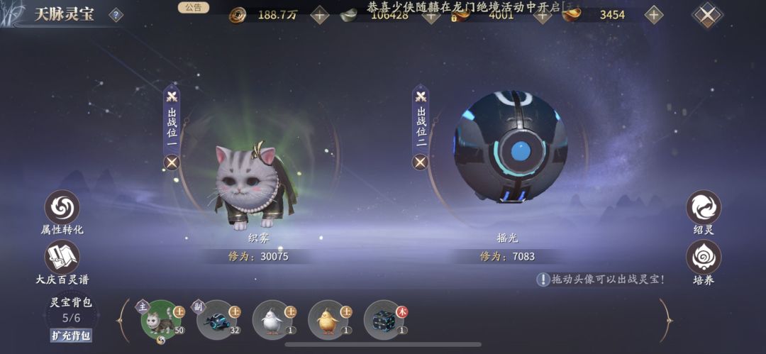 在育灵界面,可以进行灵宝育灵,育灵消耗道具“育灵露”,育灵露可以通过珍宝阁购买,也可以通过参与各种活动获得。通过育灵,可以提升灵宝的属性,使灵宝更加强大。