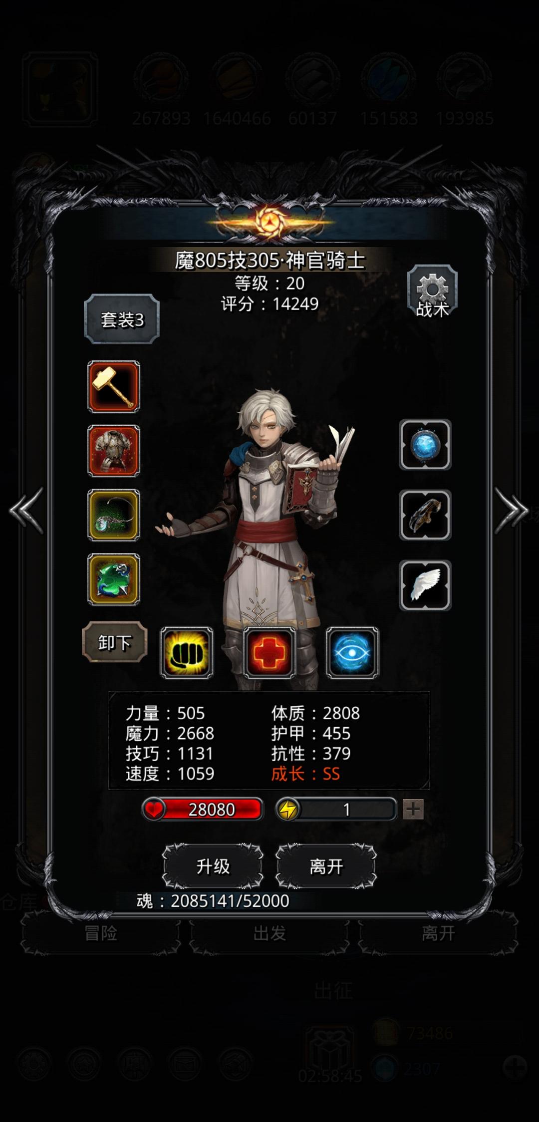 两个力量魔石分别是8狂暴10狂暴,祭祀魔石30级,我这个力量输出够了,关键是手法,在4分钟左右的时候,群魔之后,如果神官还剩8000-9000血且身上的护甲buff能持续到boss的单物,优先奶祭祀或者补嘲讽,这是因为咸鱼甲的特效,奶了反而浪费奶量,还有就是圣庭的buff不能断太久,不然容易翻车。打boss过程我发视频了,还在审核。
