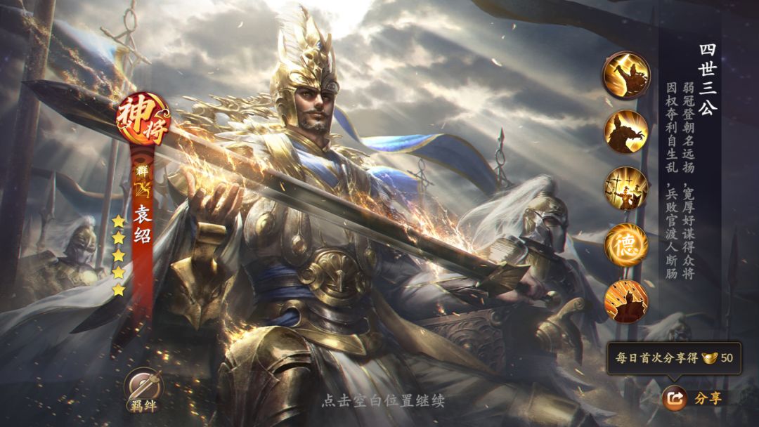 神威技能的buff配合袁绍天赋技能,使攻击范围内伤害更高,我方武将攻速更快。