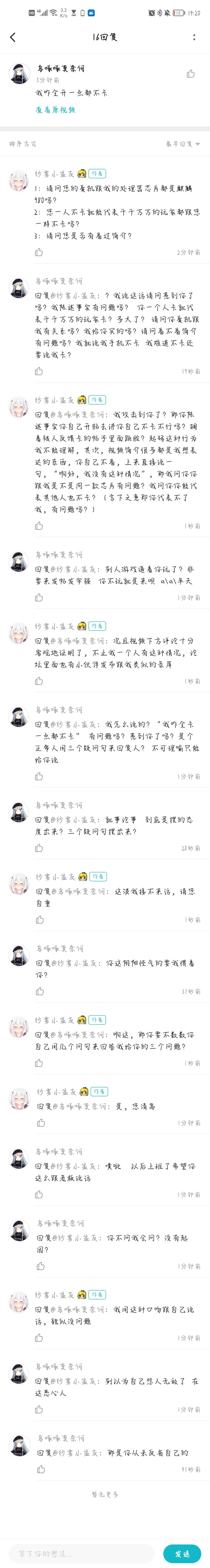 2018年末的冬天,我用着荣耀7i打着崩坏三,虽然是全低画质但流畅度有保证。2022年初的春天,我用着荣耀20打着深空之眼,就算是全低画质也很难保证流畅度。二者对比的优化差距是否有点过大?再者,2020年的九月,原神刚开服那会我用的也是这部手机,开着全高,虽然不能上60帧,但最最起码画面帧数能够稳定。那么这跟深空之眼的优化是不是也有着差距?那在动作游戏上其他厂商优先考虑的不都是“怎么才能让游戏稳定运行?”反观一眼深空之眼,我就算画质开高,同样的关卡同样的位置,改卡还是得卡,该流畅的地方依旧流畅,那么这还是我的手机的问题吗?我怼那个人,就正因为不是手机问题所以我才会阴阳他,在反馈优化问题的帖子下叫人换手机,这是不是有点不符合常理。