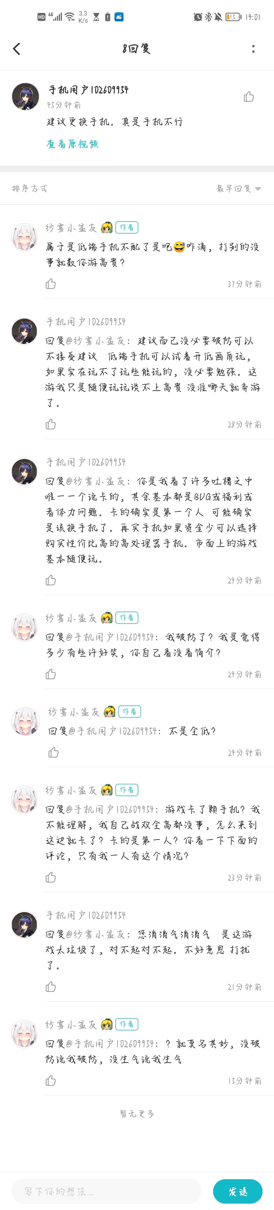 那个人面对别人对我反馈卡顿的问题提出的建议是“换台手机”,而我本人觉得此事荒唐无稽,游戏优化的问题官方不背锅优化,反而要玩家来买单,故采用极其轻蔑的语气回答了他所谓的建议。何况,上百条回复,我曾几何时阴阳其他人?要说我有阴阳,也只有他一人,荒唐的建议,就应该用荒唐的回答。