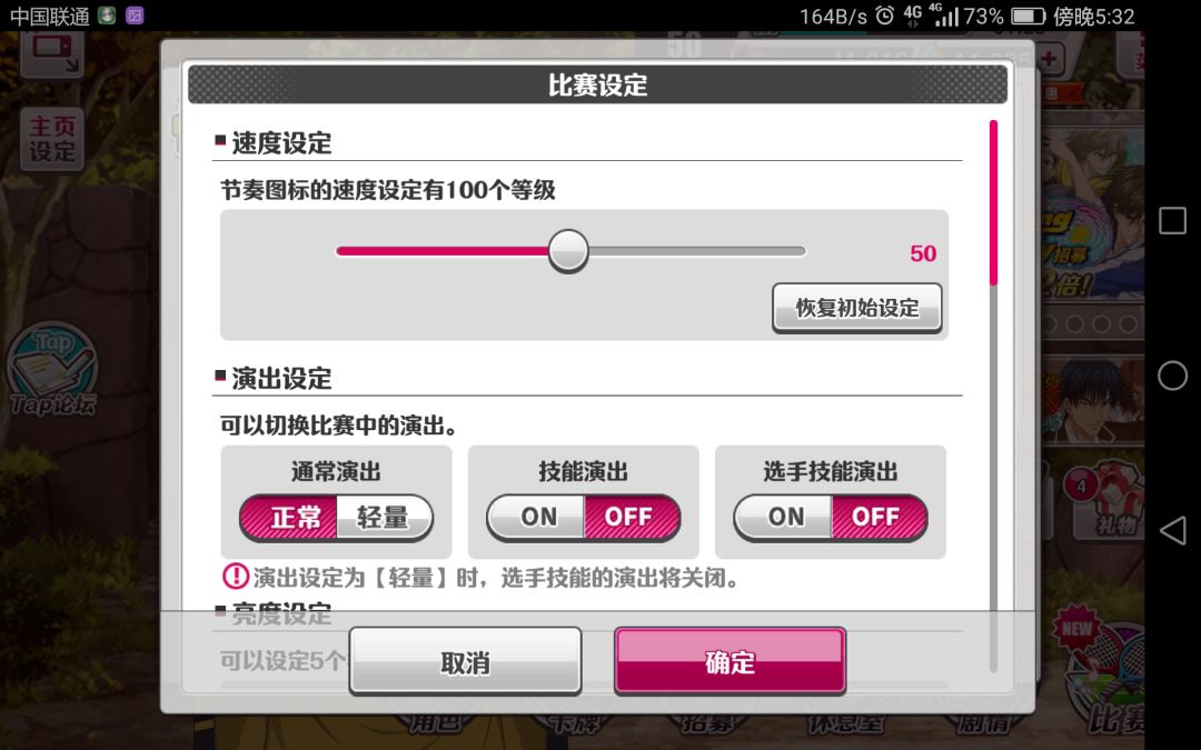 4.关于打歌的那些卡顿问题,除去bug和手机配置问题,可以试一下在比赛设定里面调速,个人感觉50初始速值很怪异,因为调到了70以上就会发现谱面的变化是真的很大,按键什么的也很丝滑(我是75/80。推荐用粉蓝键那种(忘了截图,fcm已经肝完时间了)。那种模式会看得比较清晰,不会容易漏键。如果这样也还是很卡顿的话那只能够建议把选手技能给关了吧,其实把选手技能关掉之后谱面也容易看很多(?