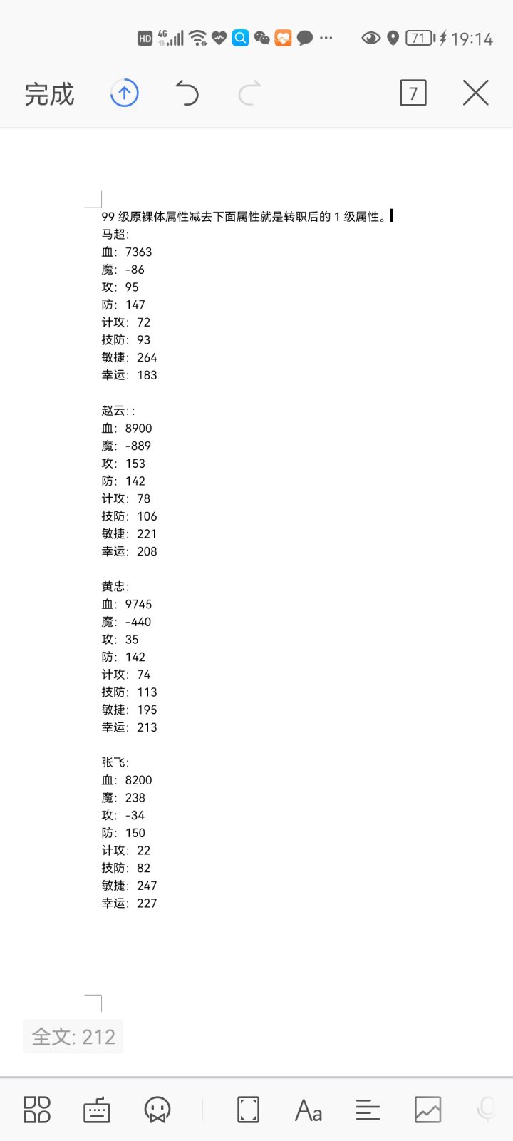 首先四个人要99狼转职,然后分别记下四个人没有任何装备下的属性,队伍配置关羽相国技能插标卖首,有一个斩字buff代表可以秒杀,现在有bug不能骑马,如果可以骑马的话可以带上黑丝龙王,然后就是需要转职的四个武将,可以带个桃子恢复tp和诸葛亮回血,战斗马时手动,除了关羽、诸葛、桃子之外全部防御,可以更快一些,注意关羽是否有斩buff有的话就释放相国印技能酒池肉林,队伍内可以带几具死尸凑满8人队伍长一些可以拦一下小马子,然后当有一个转职完之后可以换一个死尸那样的话防御都不用了。属性可以sl用原99狼转职无装备属性减去下图的属性(玩家们自测),赵云注意看看攻击,如果想转法的话可以看看转职之后的技能攻击和蓝量,张飞、马超、黄忠主要看攻击加成,黄忠可以看幸运加成,幸运影响控制效果,例如张飞99狼攻击555那么转职之后的属性减去下图的属性就是555-(-31)=586当然相差10几点就无所谓了没有必要sl因为打马还是比较累的。