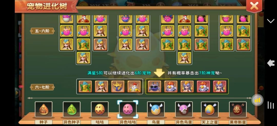 6阶:天蛋与咕咕或鸟蛋或植物融合,融合随机出一只6阶天蛋成品或7阶天蛋碎片,并同时有概率额外获得7阶天蛋碎片