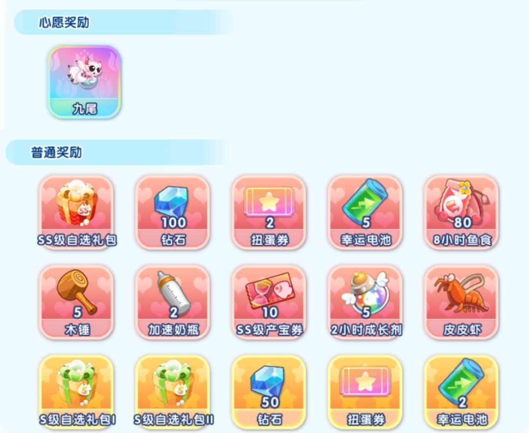 2.选择心愿清单(SSS级鱼九尾、SSS级鱼双子座、10000钻石)幸运值越高奖励越容易获得,达到500幸运值时必定获得心愿清单奖励!