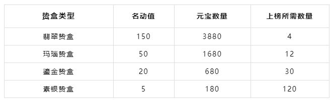 翡翠贽盒上榜所需元宝为15520,玛瑙贽盒上榜所需元宝为20160,鎏金贽盒上榜所需元宝为20400,素银贽盒上榜所需元宝为21600。