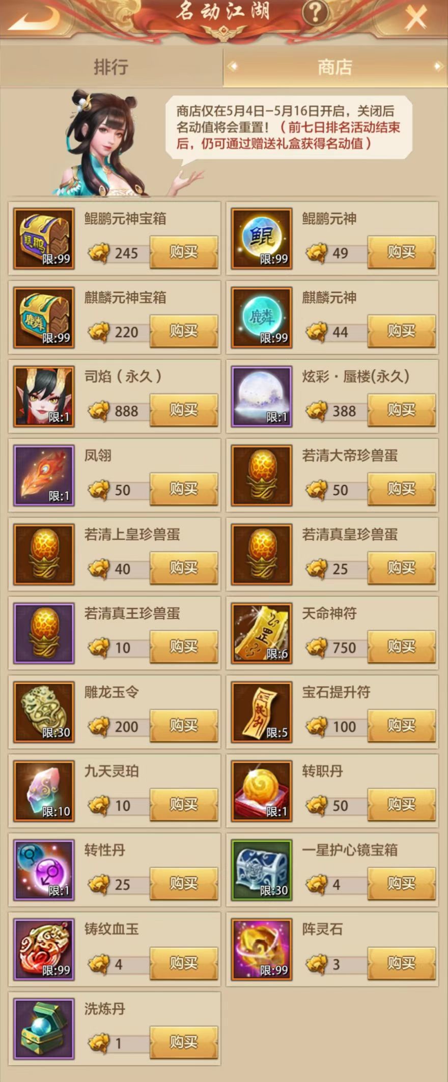 本次活动商店中,最值得兑换的是鲲鹏、麒麟元神及稀有兽灵珍兽蛋,这三种商品均仅为限时活动获取。