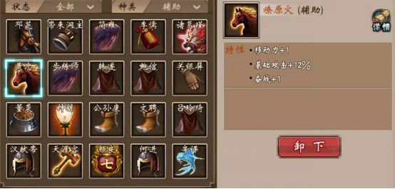 先是奋战马,奋战马是最早的奋战辅助,全名叫燎原火,如果没记错的话,应该是黄忠的坐骑,而这匹马也特别适合黄忠,黄忠本身有超高的攻击,特别是针对骑兵,伤害很高,而燎原火加移动,加奋战,加攻击,简直是为黄忠量身定做的属性。