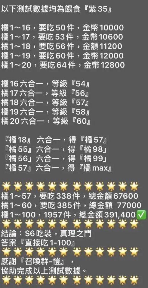 橘1~20,要吃64件,金币12800