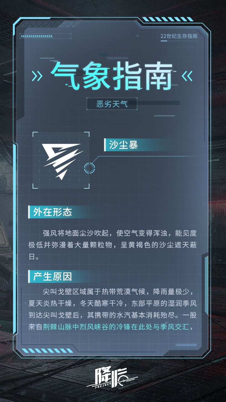 尖叫戈壁广袤的沙漠中危机四伏,如果能做到知己知彼,想必聪明的幸存者在这片诡秘莫测的土地中能有更多的生存优势!那么降临世界里还有哪些极端恶劣天气呢?下一期我们继续去探索吧~