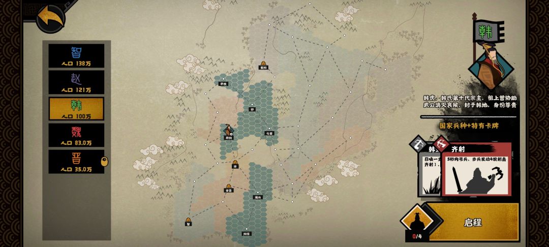初始智、韩、魏三方结盟,我们的进攻路线首先是白城,这毋庸置疑,在选择这三方势力的时候,可以利用盟友的军事通行权,跳击白城,获得前期优势。同时可以利用盟友进行共伐,优先攻击赵国抢人头。在我方势力较大后再考虑攻击晋国,避免四邻交恶。
