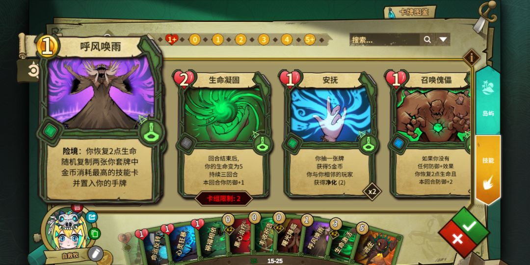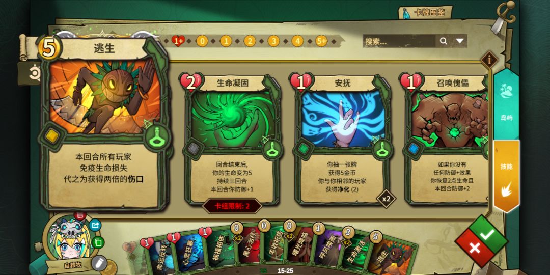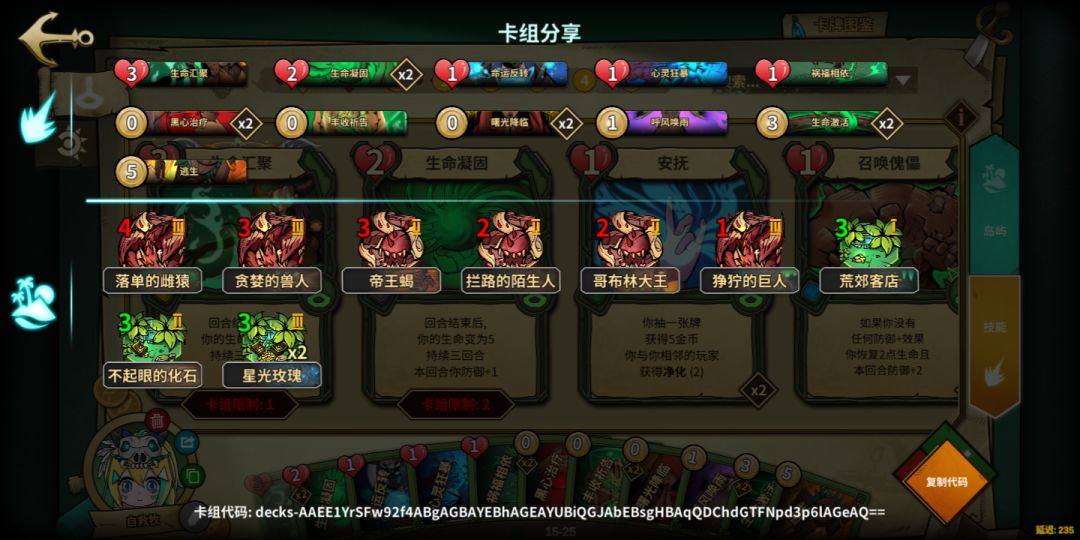 本套卡组最高费卡为5金逃生,只要呼风唤雨发动成功,必定得到两张逃生复制,搭配本体复制,可连续无敌三回合,这就是保命的最大依仗!