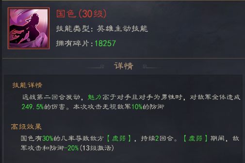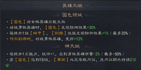 1.天赋:国色能对女性英雄生效、对战男性英雄,国色无视效果+30%