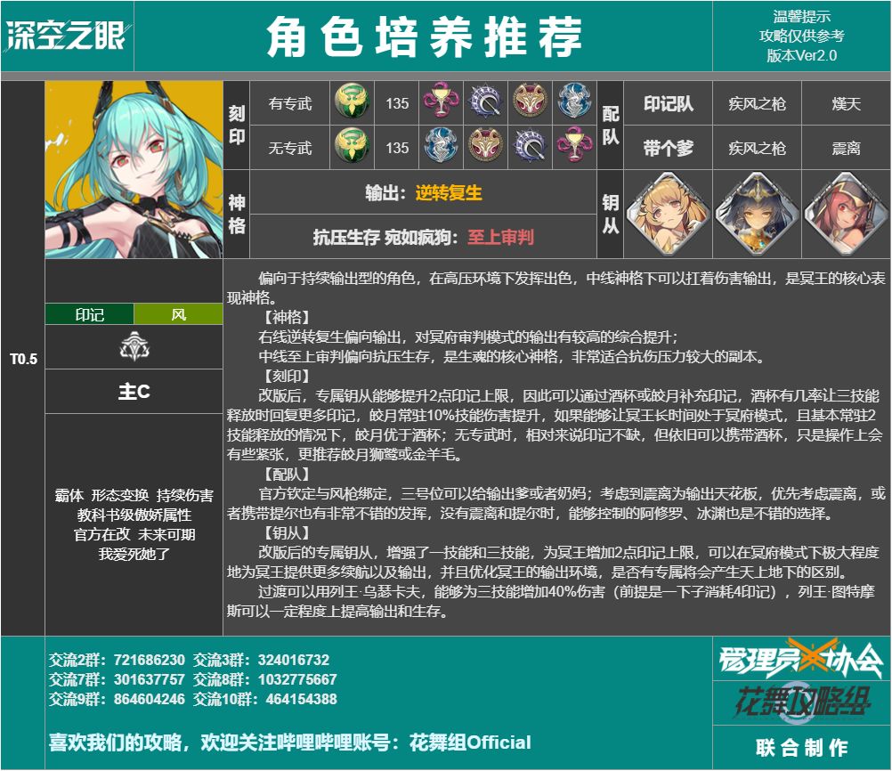 关于技能解析、钥从、配队、神格、刻印的详细推荐,可以前往花舞组的官方攻略号查看:https://www.bilibili.com/read/cv16481331