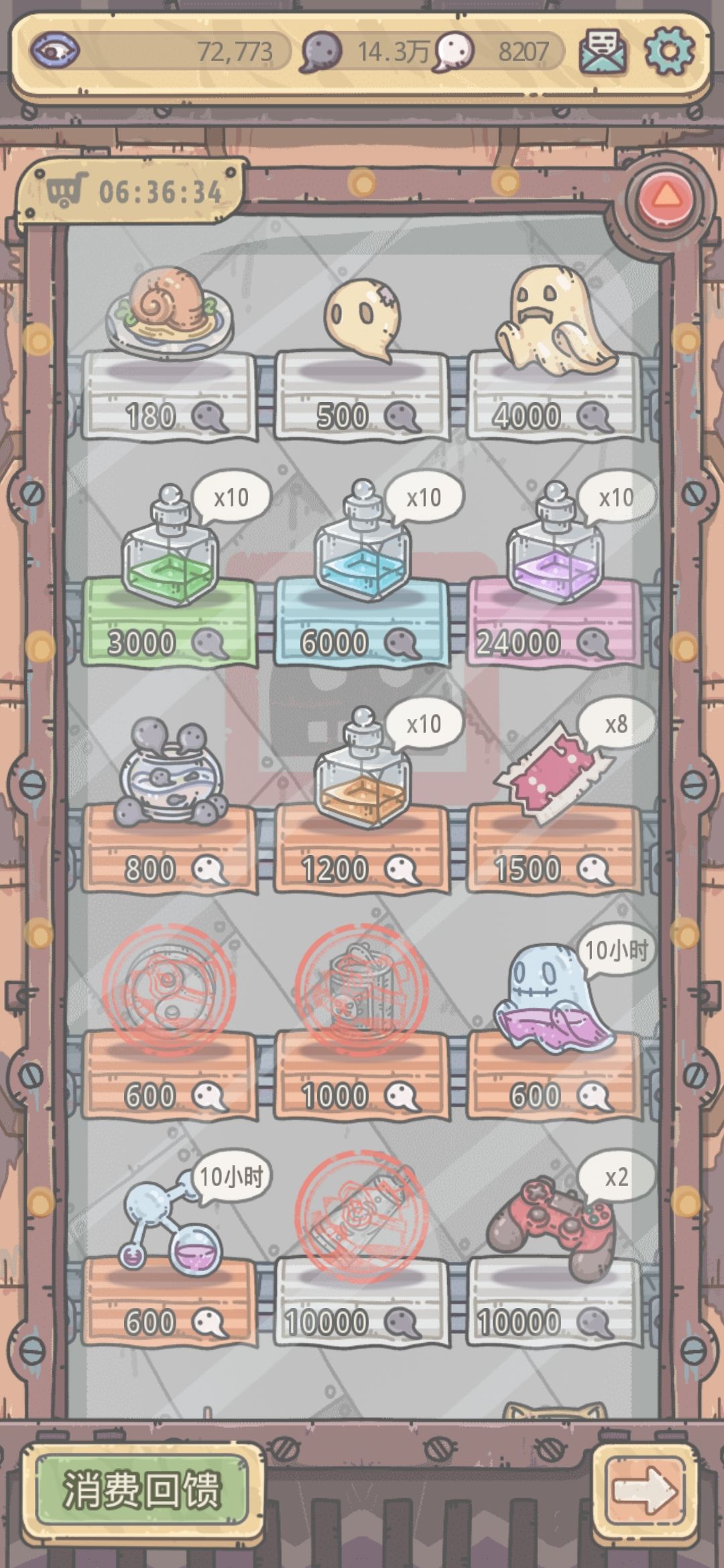 8、在自动售卖机开启以后肯定会有很多选择恐惧症开始纠结买什么了。先把500白蝌蚪礼包买了,然后说明一下黑蝌蚪在这个游戏非常缺。第一行那个食物后期缺了就买不值钱。两个灵魂买了就去池塘左面供奉。这个很重要。(关于供奉前期放那个第一次加成的先,还有龙珠大黑天要留着供奉周提前使用,这个如果需要可以看详细帖子或者之后我出一个。)再就是许愿币抽奖券加速这几个白蝌蚪买的可以资金充裕就买优先许愿币。粘合剂每天必须买满五次,当然第一天如果钱少的话没办法。再就是一些装备根据自己需求购买前几个还行,后面的性价比不高,等有钱了再说。对于猫罐头优先级别比抽奖券高但是前期不买因为买了你打不过。