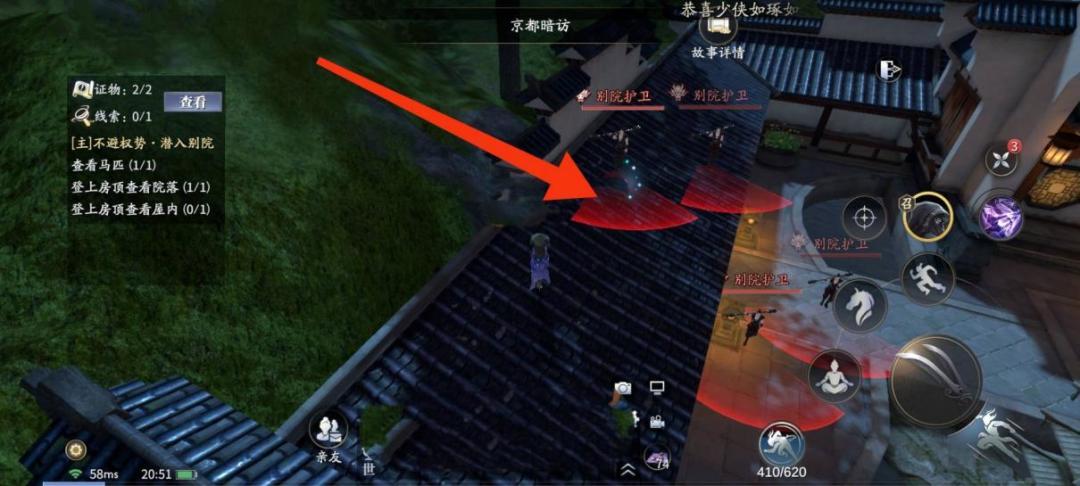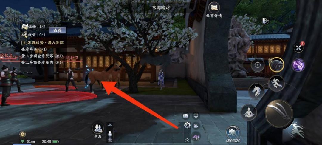 躲过别院护卫的视线,跳进第一个院子查看马匹。务必掌握好时机,线索的位置会与护卫巡逻的位置重合。