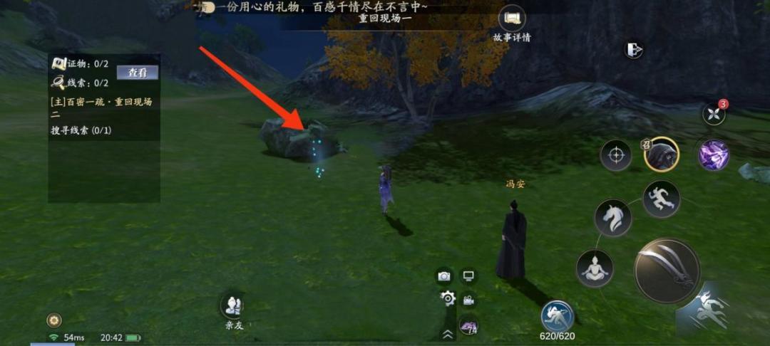 与冯安对话后前往后山。与监察院弟子交谈,上山跟踪闪亮的足迹x3,与闪现的冯安对话。