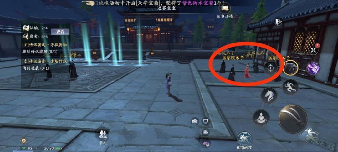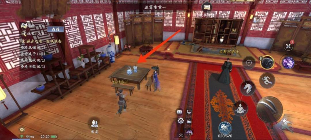 去找院子里小红红那拨人,与其中的监察院弟子对话、与小红红对话,可假意答应与她假戏真做一番,事后守诺给钱,她会帮你排除很多探寻地点的错误选项。