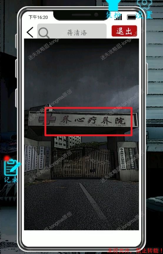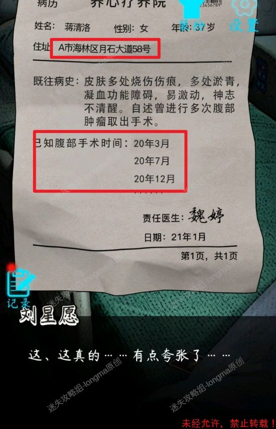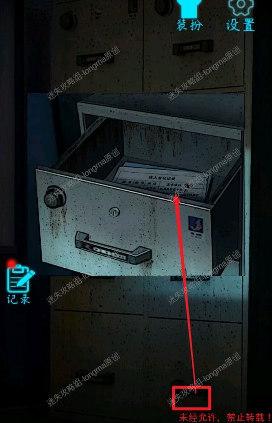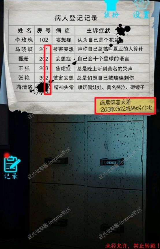 20.打开右下角的档案柜,记住里面病人登记记录的信息,根据里面的信息得出蒋清洛在303房间(右下角说明蒋清洛的房间和203、302非常的近,根据登记记录上的房号顺序,蒋清洛应该在303房间),选择【303】。20 20.1