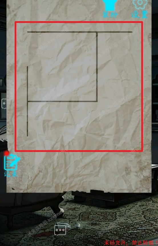 26.常看地上破碎的镜子,茶几下的纸张(记住纸张上的图案,如图26),地毯上的红酒杯,沙发后面墙上的照片,书架上的奖杯。26