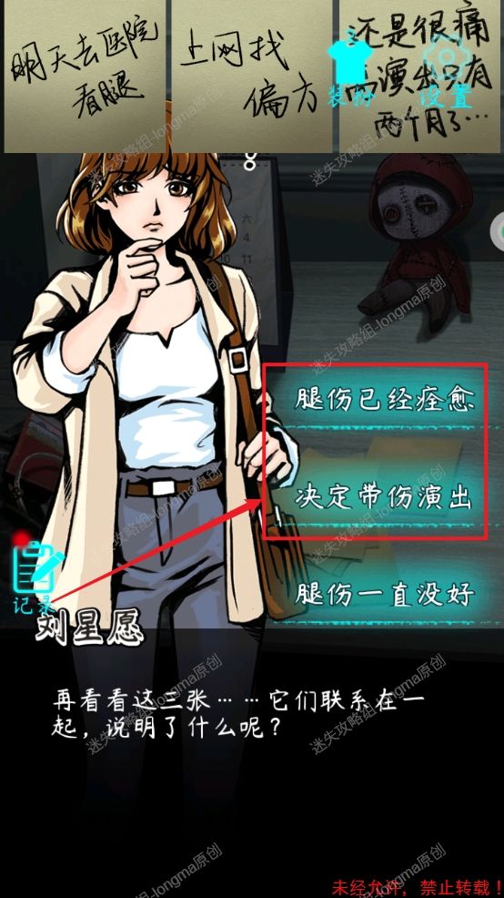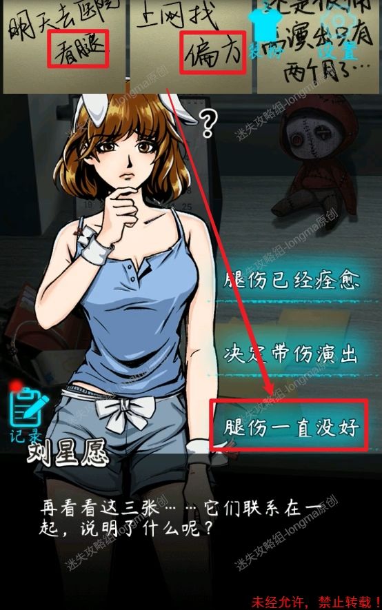 13.再次查看桌子上的便签,选择【腿伤一直没好】。13