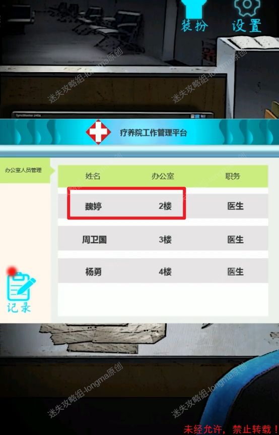 19.在病例当中找到蒋清洛的检查单,记录上面的医生魏婷,查看电脑桌面上的信息,得知魏婷在2楼办公,选择【二楼】。19 19.1