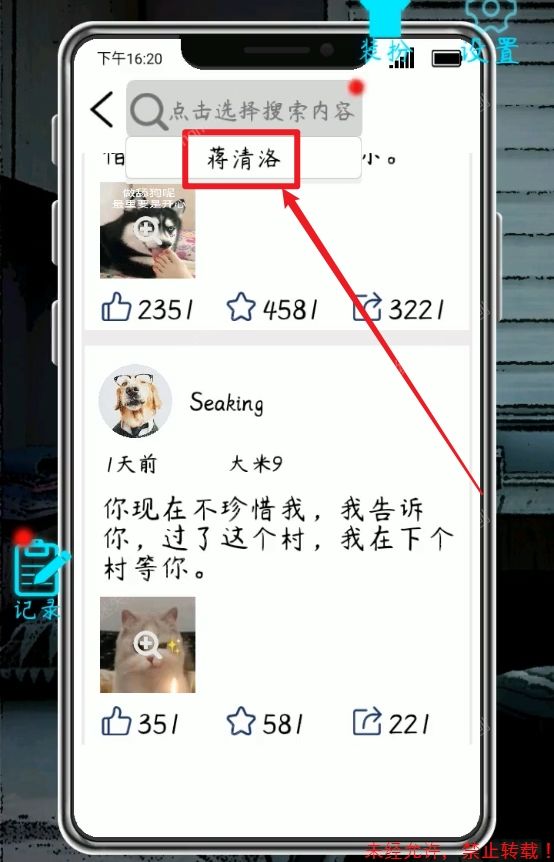 16.查看手机中的聊天信息,退出聊天信息后,再次进入手机页面,点击选择搜索内容,搜索【蒋清洛】,查看最上面的一条信息,得知蒋清洛的地址。16 16.1