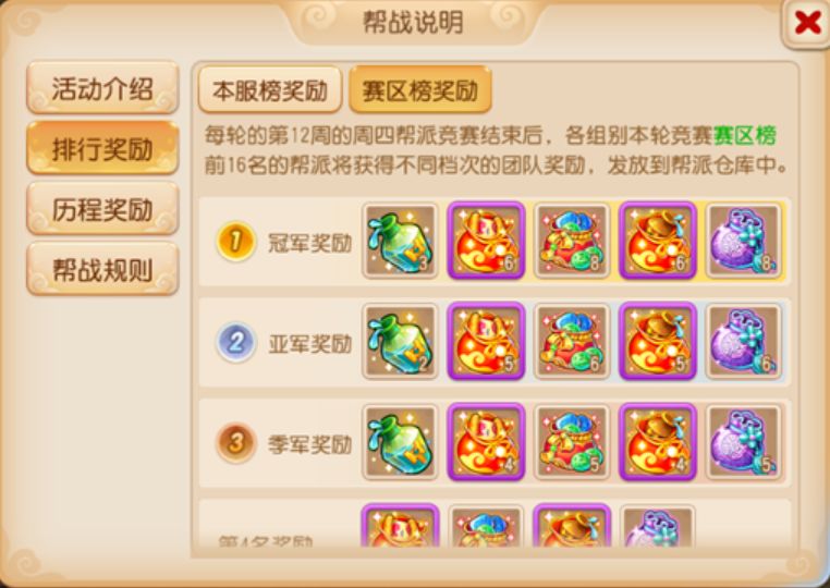 若你所在服务器的帮派在跨服赛事中获得前三名的佳绩,则本服全部玩家帮战历程八十胜时将额外增加高级五宝奖励。