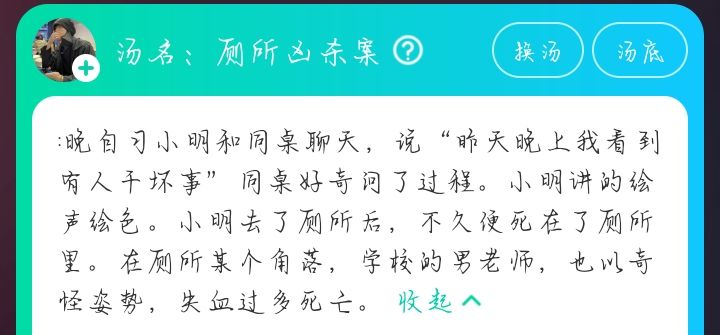 玩法为玩家向房主提出问题,房主根据汤底用是,不是,是也不是,不重要,回答玩家的问题,最后玩家可根据“是”的线索编制出汤底