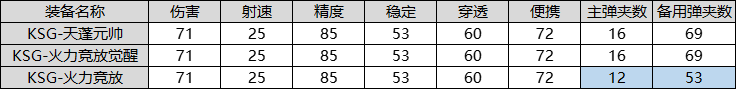 小结:本次选取对比的三把枪械在基础属性方面竟然出奇的一致,未觉醒的火力竞放仅在弹匣数量方面处于劣势,续航能力有待提升。觉醒后的KSG-火力竞放是和大家熟悉的“猪喷”一个水准的枪械!