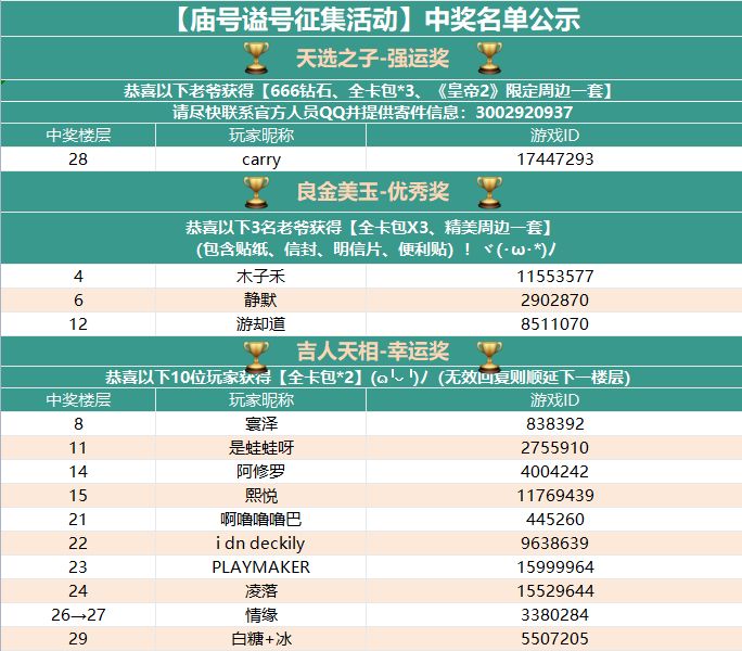 奖励道具近期将直接发放到大人们的游戏遗诏中,请中了实物周边的老爷尽快添加官方人员QQ:3002920937,并提供收件信息,我们将尽快安排快递寄送